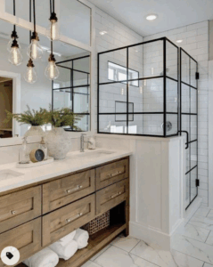With the rising consideration for building an environment with more natural light, and construction products, some manufactures are now developing finishes with natural selections in mind. White wall color can accent the designs in the space and other complementary colors. The white walls in this bathroom (left) shows the room to look larger and complements the brown wood cabinet color. Light browns can add softness and warmth to the space. Clear glass around the shower improves the visibility of the rooms.